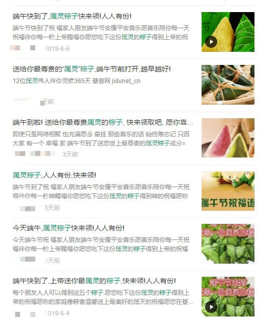 而在刚刚我们度过的端午假期,基督徒的微信圈又一次遭遇新一拨密集式的鸡汤信息轰炸,这次鸡汤信息的主题都和端午有关。因为端午节在中国是和春节、清明节、中秋节并列的四大传统节日之一,这些“主内”宗教营销公众号们自然不会放弃这一炒作的大好良机,纷纷给端午节予以属灵包装,进行大肆炒作,其套路和过年差不多,就是“送祝福”。